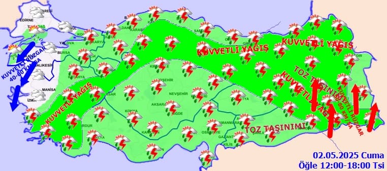 Meteoroloji Genel Müdürlüğü tarafından yapılan tahminlere göre: Ülkemiz genelinin parçalı ve çok bulutlu, Marmara’nın doğusu, Güney ve İç Ege, Akdeniz, İç Anadolu, Karadeniz, Doğu ve Güneydoğu Anadolu ile öğle saatlerinden sonra Tekirdağ ve Çanakkale çevrelerinin aralıklı sağanak ve gök gürültülü sağanak yağışlı geçeceği tahmin ediliyor. Yağışların, Orta ve Doğu Karadeniz, Doğu Anadolu (Malatya, Van ve Iğdır hariç) ile Muğla, Aydın, Uşak, Denizli, Afyonkarahisar, Antalya’nın batı iç kesimleri, Isparta ve Burdur’un batısı, Ankara, Eskişehir’in doğusu, Çankırı, Kırşehir, Yozgat, Kırıkkale’nin kuzeyi, Sivas, Karabük’ün doğusu, Kastamonu, Adıyaman, Ş. Urfa’nın kuzeyi, Diyarbakır, Batman ve Siirt çevrelerinde yer yer kuvvetli olması bekleniyor. Doğu Anadolu’nun doğusu ile Güneydoğu Anadolu’da toz taşınımı bekleniyor.
