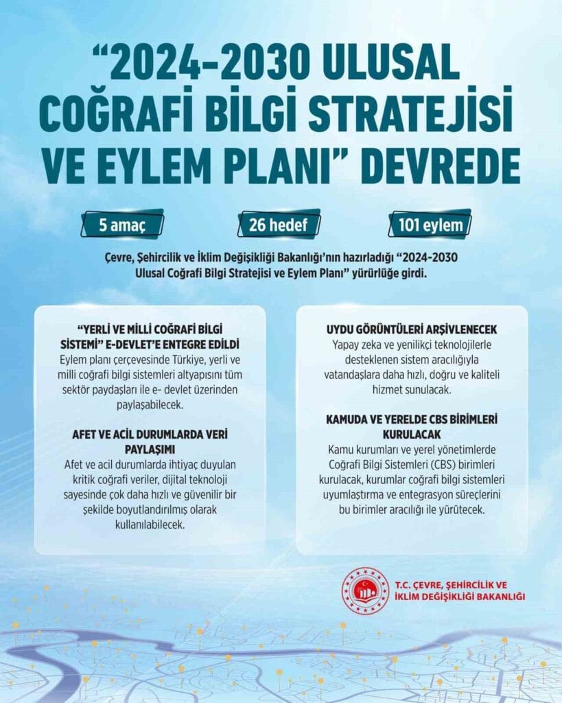 Çevre, Şehircilik ve İklim Değişikliği Bakanlığı’nın hazırladığı “2024-2030 Ulusal Coğrafi Bilgi Stratejisi ve Eylem Planı” Resmi Gazete’de yayımlanarak yürürlüğe girdi.