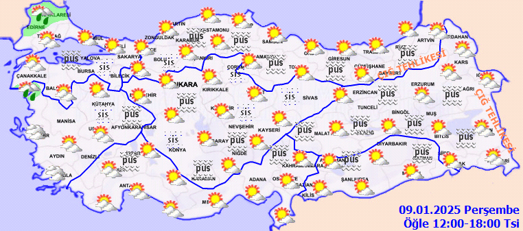 Meteoroloji Genel Müdürlüğü tarafından yapılan son tahminlere göre; Yurdun batı kesimlerinin parçalı ve yer yer çok bulutlu, Edirne ve Kırklareli çevreleri ile Çanakkale’nin güney, Balıkesir’in güneybatı kıyı kesimlerinin yağmur ve sağanak yağışlı, diğer yerlerin parçalı ve az bulutlu geçeceği tahmin ediliyor. Yurdun iç ve doğu kesimlerinde buzlanma ve don ile birlikte pus ve yer yer sis hadisesi bekleniyor. Doğu Karadeniz’in iç kesimlerinin yüksekleri ile Doğu Anadolu’nun yüksek ve dik yamaçlarında çığ tehlikesi bulunmaktadır.