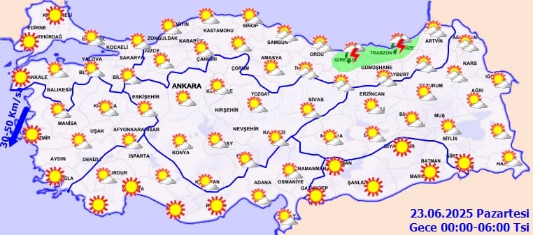 Meteoroloji’den yapılan son hava durumu tahminlerine göre; Giresun, Trabzon ve Rize çevreleri yağmurlu diğer bölgeler az bulutlu ve açık geçecek. Hava sıcaklıkları mevsim normalleri üzerinde seyrederken, sıcaklıkların artması bekleniyor.