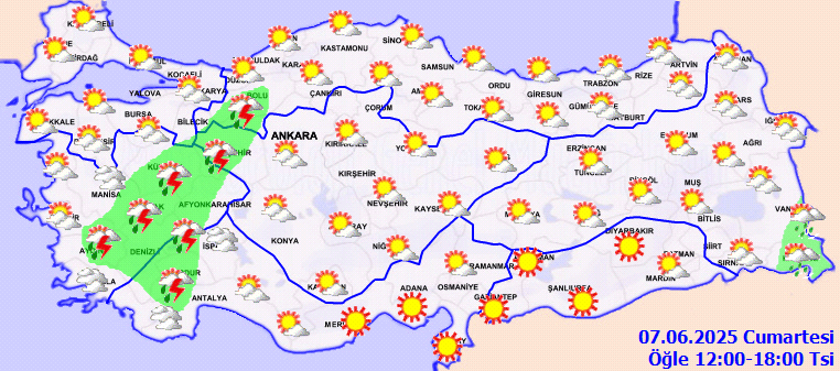 Meteoroloji Genel Müdürlüğü tarafından yapılan tahminlere göre: Ülkemizin batı kesimlerinin parçalı, yer yer çok bulutlu, öğle saatlerinden sonra Kütahya, Uşak, Denizli, Aydın’ın iç kesimleri, Burdur, Bolu, Eskişehir ve Hakkari çevreleri ile Afyonkarahisar ve Isparta’nın kuzey ve batı kesimlerinin yerel olmak üzere sağanak ve gök gürültülü sağanak yağışlı, diğer yerlerin az bulutlu ve açık geçeceği tahmin ediliyor.