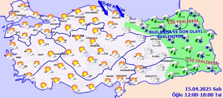 Meteoroloji Genel Müdürlüğü tarafından yapılan tahminlere göre: Ülkemizin doğu kesimlerinin çok bulutlu, Doğu Karadeniz kıyıları, Doğu Anadolu’nun güneybatısı ve Güneydoğu Anadolu’nun doğusu ile Ordu, Tokat, Şırnak ve Iğdır çevrelerinin yağmurlu, İç Anadolu’nun doğusu, Doğu Karadeniz’in iç kesimleri ile Doğu Anadolu’nun kuzey ve doğusunun karla karışık yağmur ve kar yağışlı, diğer yerlerin parçalı ve az bulutlu geçeceği tahmin ediliyor. Yağışların; sabah saatlerinde Hakkari ve Şırnak çevrelerinde yerel kuvvetli olması bekleniyor. Sabah ve gece saatlerinde iç ve doğu kesimlerde buzlanma ve don olayı bekleniyor. Doğu Karadeniz’in iç kesimlerinin yüksekleri ile Doğu Anadolu’nun yüksek ve eğimli alanlarında çığ tehlikesi bulunmaktadır.