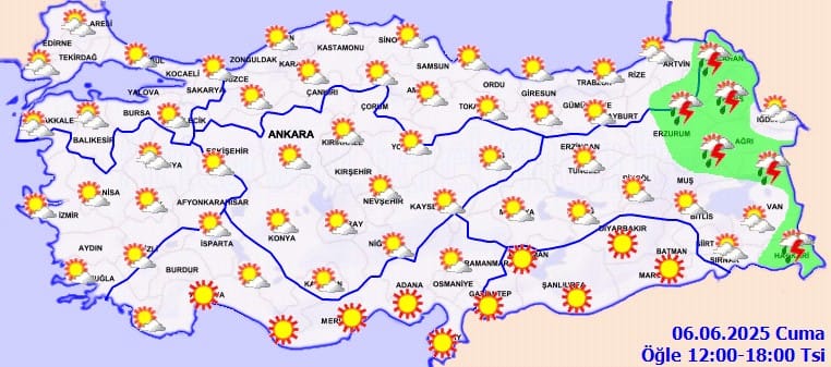 Parçalı, yer yer çok bulutlu, öğle saatlerinden sonra Erzurum, Kars, Ardahan, Ağrı ve Hakkari çevreleri ile Van’ın doğusunun yerel olmak üzere sağanak ve gök gürültülü sağanak yağışlı geçeceği tahmin ediliyor.