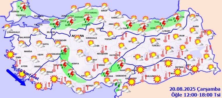 Meteoroloji’den yapılan son hava durumu tahminlerine göre; Trakya, Batı ve Doğu Karadeniz, Akdeniz’in Toroslar mevkisi, Çankırı, Konya, Balıkesir ve Hatay gök gürültülü sağanak yağmurlu olacak. Hava sıcaklıkları güney ve doğu kesimlerde mevsim normalleri üzerinde seyredecek.
