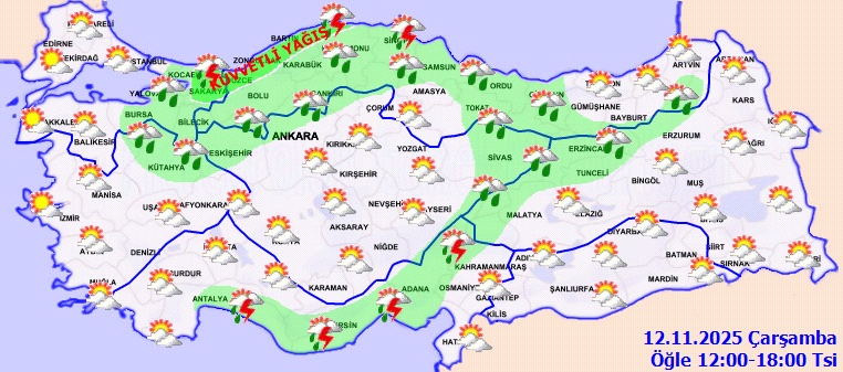 - Karadeniz: Batı ve Orta kesimlerde kuvvetli sağanak; Giresun, Trabzon ve Gümüşhane’de aralıklarla yağmur.