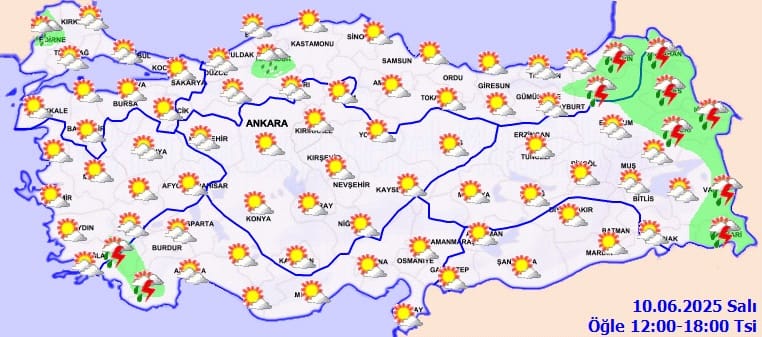 Parçalı ve az bulutlu, zamanla doğusunun yer yer çok bulutlu, Ardahan, Kars, Ağrı, Iğdır ve Hakkari çevreleri ile Van’ın doğu kesimlerinin yerel olmak üzere sağanak ve gök gürültülü sağanak yağışlı geçeceği tahmin ediliyor.