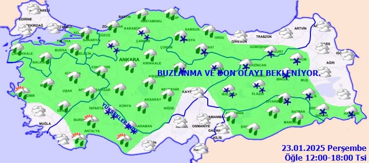 Meteoroloji Genel Müdürlüğü tarafından yapılan son tahminlere göre: Ülkemiz genelinin parçalı ve çok bulutlu, Marmara’nın güney ve doğusu, Kuzey ve İç Ege, Batı Akdeniz, İç Anadolu, Karadeniz (Rize ile Artvin kıyıları hariç), Doğu Anadolu, Güneydoğu Anadolu ile K. Maraş çevrelerinin aralıklı yağışlı geçeceği tahmin ediliyor. Yağışların genellikle yağmur ve sağanak, Batı Akdeniz’in Toroslar mevkii, İç Anadolu’nun doğusu, Karadeniz’in iç kesimleri, Doğu Anadolu ile K. Maraş, Afyon ve Kütahya’nın yüksek kesimlerinde karla karışık yağmur ve kar şeklinde olması bekleniyor. Ülkemizin iç ve doğu kesimlerinde buzlanma ve don ile birlikte pus ve yer yer sis hadisesi görüleceği tahmin ediliyor. Doğu Karadeniz’in iç kesimlerinin yüksekleri ile Doğu Anadolu’nun yüksek ve dik yamaçlarında çığ tehlikesi bulunmaktadır.