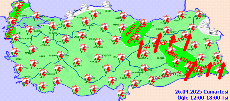 Yağışların; Edirne, Kırklareli, Çanakkale, Adana, Osmaniye, Nevşehir, Yozgat, Sivas, Tokat, Ordu, Giresun, Tunceli, Bingöl, Bitlis, Diyarbakır, Batman, Siirt, Şırnak ve Hakkari çevreleri ile Hatay’ın kıyı, Van’ın kuzey kesimlerinde yerel kuvvetli olması beklendiğinden yaşanabilecek olumsuzluklara karşı dikkatli ve tedbirli olunması gerekmektedir.