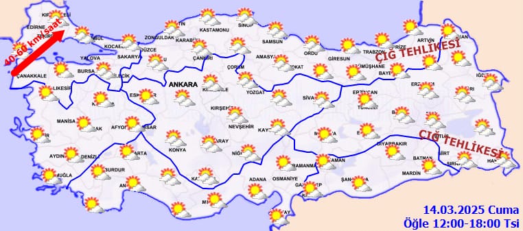 Meteoroloji Genel Müdürlüğü tarafından yapılan tahminlere göre: Ülkemiz genelinde yağış beklenmiyor. Ülkemizin kuzey ve doğu kesimlerinin parçalı bulutlu, diğer yerlerin az bulutlu ve açık geçeceği tahmin ediliyor. Rüzgarın; Marmara’nın batısında güneyli yönlerden kuvvetli olarak (40-60 km/saat) esmesi bekleniyor. Sabah ve gece saatlerinde doğu kesimlerde buzlanma ve don olayı ile birlikte pus ve yer yer sis bekleniyor. Doğu Karadeniz’in iç kesimlerinin yüksekleri ile Doğu Anadolu’nun yüksek ve dik yamaçlarında çığ tehlikesi bulunmaktadır.