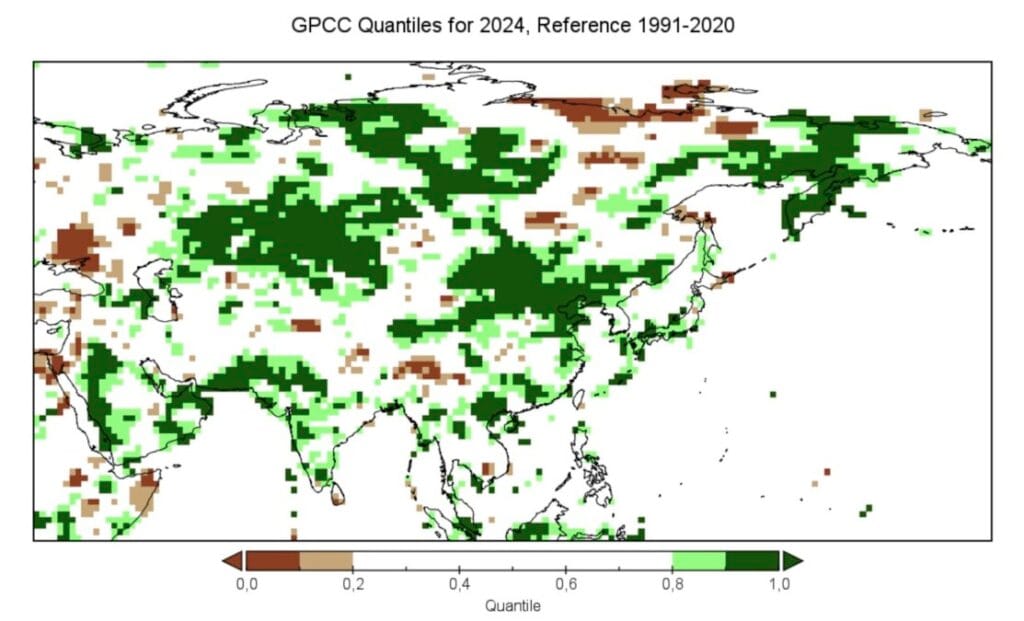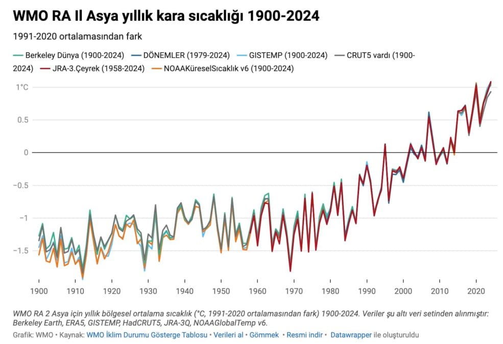 2024’te Asya’nın ortalama sıcaklığı, 1991–2020 ortalamasının yaklaşık 1,04°C üzerinde gerçekleşti. Veri setine bağlı olarak bu yıl, kıtada kayıtlardaki en sıcak veya ikinci en sıcak yıl olarak değerlendirildi.