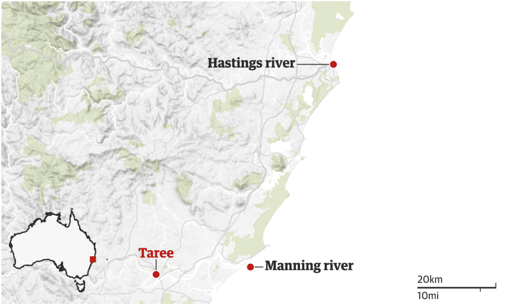 Meteorolog Dean Narramore, Çarşamba günü Forster’ın kuzeyindeki bölgelerde 50 ila 150 mm arası yağış öngördüklerini, yüksek bölgelerde bu miktarın 200 mm’yi aşabileceğini söyledi. Bazı alanlarda 300 ila 400 mm’ye varan yağışlar, ani seller ve nehir taşkınları yaşanmasına neden oldu.