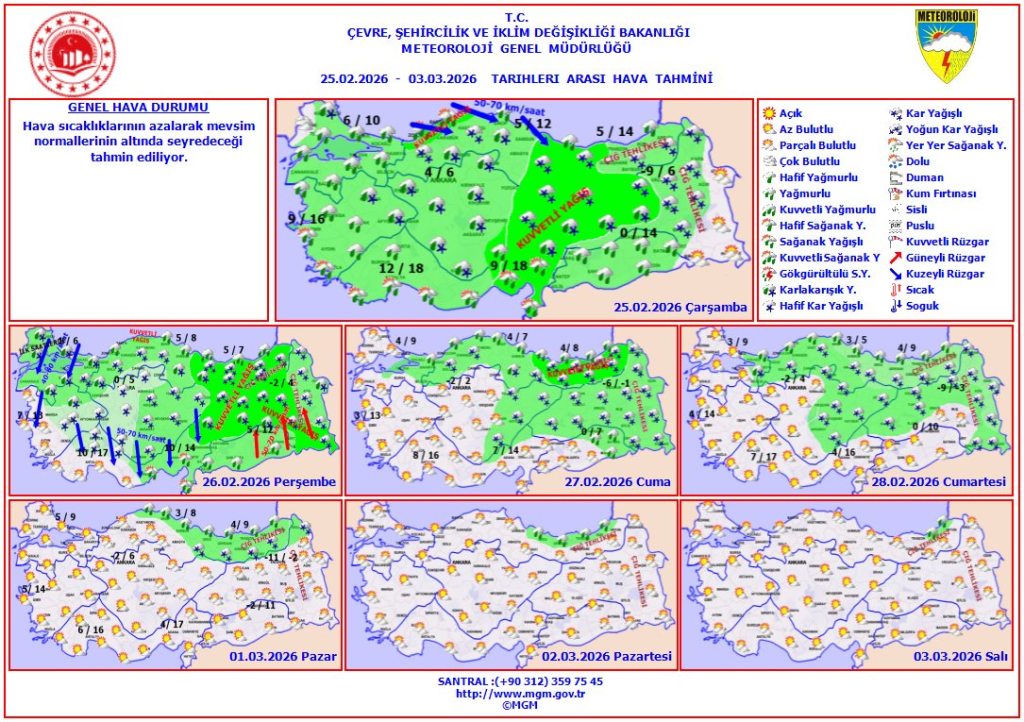 Yüksek yerlerde perşembe günü kuvvetli olmak üzere, cuma ve cumartesi de kar bekleniyor. Başta Karadeniz ve Doğu Anadolu olmak üzere “kuvvetli kar yağışları” öngörülürken, denizlerde fırtına ve kıyı merkezlerde yağmur bekleniyor. Önümüzdeki 4 gün, ülke genelinde soğuk ve yağışlı kış koşulları etkili olacak.