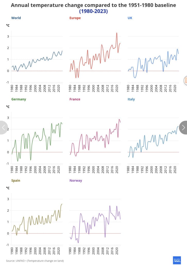 BM Gıda ve Tarım Örgütü’nün (FAO) arazi sıcaklık değişimi verilerine göre, 2023 yılında küresel kara yüzeyi sıcaklık artışı 1,8°C olarak kaydedildi. Ancak Avrupa’da sıcaklıklar 2,4°C arttı.