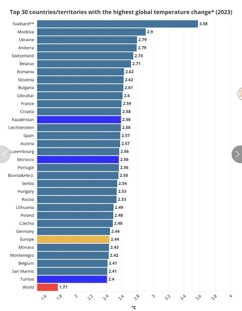 • Doğu Avrupa ve Baltık ülkeleri hızla ısınıyor: Belarus (2,29°C), Rusya (2,27°C), Estonya (2,26°C), Letonya (2,24°C) ve Litvanya (2,24°C).