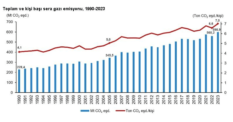 Kişi başına düşen toplam sera gazı emisyonu da arttı. 1990 yılında 4,1 ton, 2022 yılında 6,6 ton, 2023 yılında ise 7 ton karbondioksit eş değeri olarak ölçüldü.