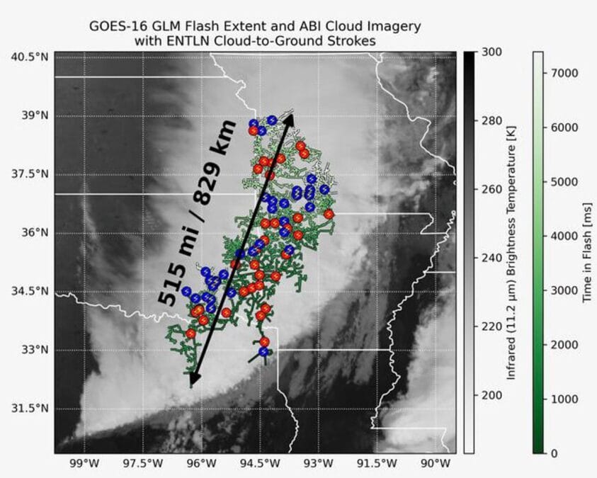 Bu rekor kıran şimşek, Teksas’ın doğusundan Missouri’deki Kansas City yakınlarına kadar uzanarak, kabaca Paris ile Venedik arasındaki mesafeye denk geldi. Bu olay, önceki rekoru 61 kilometre farkla geride bıraktı. Daha önceki rekor, 29 Nisan 2020’de yine Büyük Ovalar’da kaydedilen 768 kilometre uzunluğundaki şimşeğe aitti.