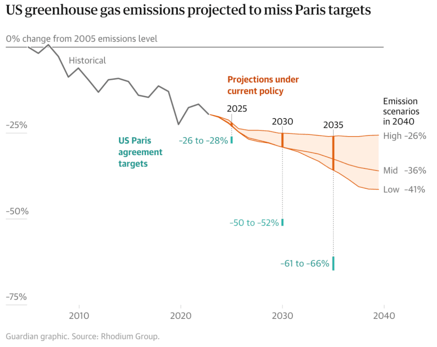 Rhodium Group’un tahminine göre, Trump’ın Beyaz Saray’a yeniden girmesinden bu yana yaşanan “yakın tarihteki en ani enerji ve iklim politikası değişikliği”, ABD’nin emisyon azaltım hızını son 20 yılda elde edilen oranın yarısına düşürecek.