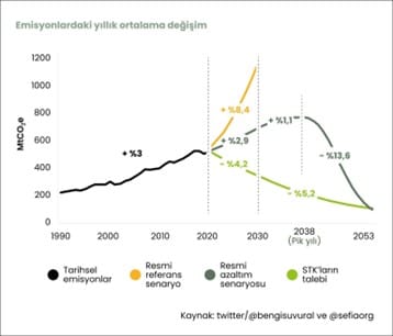 Türkiye’nin Paris İklim Anlaşması kapsamında taahhüt ettiği sera gazı emisyonlarını 2030 yılına kadar %41 azaltma hedefi, emisyon artışı üzerinden bir azaltım vadediyor. Bizler ise iklim krizinin yıkıcı etkilerini hâli hazırda yaşayan Dünya’mıza bakıyoruz ve diyoruz ki: İklim krizi ile mücadele için emisyonların bugünden itibaren mutlak olarak azaltılmasının hedeflenmesi şart.