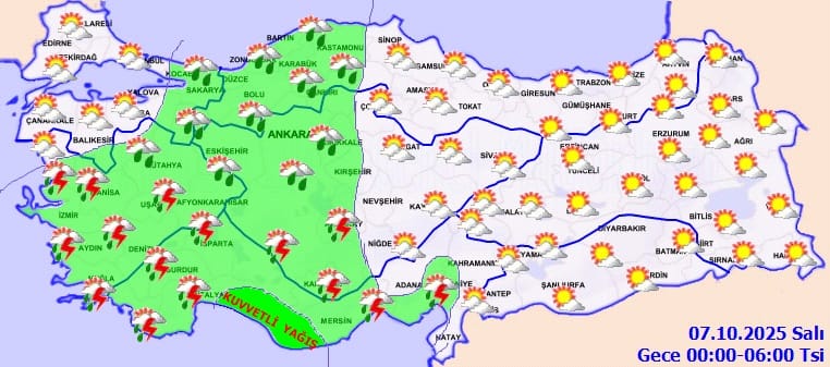 - Kuvvetli Yağış Alanları: Marmara Bölgesi’nin geneli, Ege ve Batı Akdeniz’in iç bölgeleri ile İç Anadolu’dan Ankara’nın batısı ve Eskişehir çevreleri.