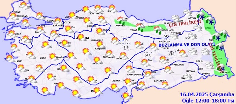 Meteoroloji Genel Müdürlüğü tarafından yapılan tahminlere göre: Ülkemizin kuzey, iç ve doğu kesimlerinin parçalı ve çok bulutlu, Orta Karadeniz (Çorum hariç), Doğu Anadolu’nun doğusu ile Sinop, Sivas, Artvin ve Siirt çevrelerinin yağışlı, diğer yerlerin az bulutlu geçeceği rahmin ediliyor. Yağışların yağmur ve sağanak, Doğu Anadolu’nun doğusunun yükseklerinde karışık yağmur ve kar yağışı şeklinde olması bekleniyor. Sabah ve gece saatlerinde Marmara’nın güney ve doğusu, Batı Karadeniz, İç Anadolu ve Doğu Anadolu’nun batısında saatlerinde pus ve sis bekleniyor. Sabah ve gece saatlerinde iç ve doğu kesimlerde buzlanma ve don bekleniyor. Doğu Karadeniz’in iç kesimlerinin yüksekleri ile Doğu Anadolu’nun yüksek ve eğimli alanlarında çığ tehlikesi bulunmaktadır.