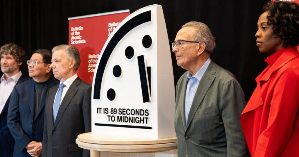 Atom Bilim İnsanları Bülteni (Bulletin of Atomic Scientists), küresel felaket risklerine dikkat çekmek amacıyla her yıl güncellediği “Kıyamet Saati”ni (Doomsday Clock) gece yarısına 89 saniye kala olarak ayarladı. Bu, insanlığın teorik yok oluş noktasına şimdiye kadar en yakın olduğu zaman dilimi olarak kaydedildi.