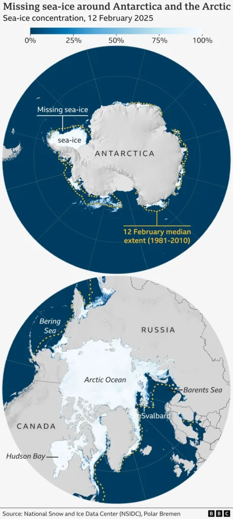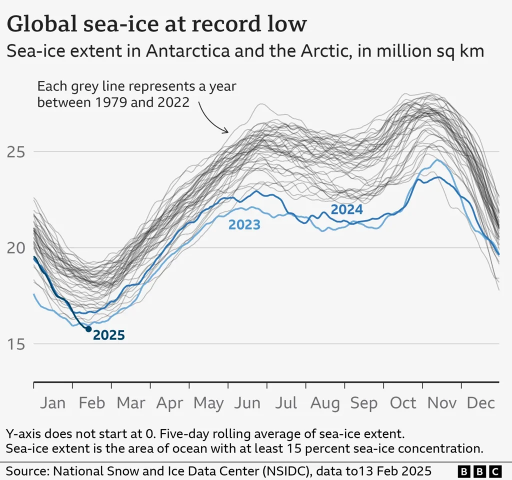 Uydu verileri, gezegenimizin serin kalmasına yardımcı olan deniz buzlarının tarihin en düşük seviyelerine yaklaştığını gösteriyor. BBC’nin ABD Ulusal Kar ve Buz Veri Merkezi’nden (NSIDC) aldığı verilere göre, 13 Şubat 2025 itibarıyla Arktika ve Antarktika’daki toplam deniz buzu alanı 15,76 milyon km²’ye düştü.