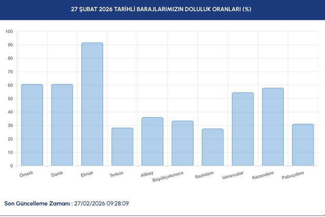 İstanbul baraj doluluk oranı İSKİ tarafından güncel duyuruluyor. İstanbul’da son yağışlarla birlikte su seviyelerinde artış görülürken, Elmalı Barajı yüzde 91’i aşarak en yüksek doluluğa ulaştı. En düşük baraj doluluk seviyesi Sazlıdere 27 seviyesinde ölçüldü. Peki, 27 Şubat 2026 İstanbul baraj doluluk oranı yüzde kaç oldu?