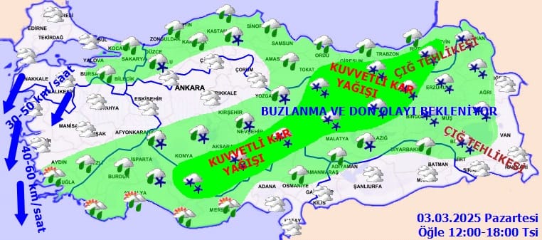 Meteoroloji’den yapılan son hava durumu tahminlerine göre; Marmara’nın doğusu, Karadeniz ve Akdeniz’in kıyı kesimleri sağanak yağmurlu, iç kesimleri ile İç Anadolu’nun güney ve doğusu ile Doğu Anadolu Bölgesi kar yağışlı olacak. Yağışlar, İç Anadolu’nun güney, Doğu Karadeniz ve Doğu Anadolu’nun kuzeyinde kuvvetli kar olarak görülecek. Marmara ve kıyı Ege’de kuvvetli poyraz etkili olacak. Hava sıcaklıklarının 3 ila 5 derece düşmesi bekleniyor. İç bölgelerde buzlanma, don ve çığ tehlikesi sürüyor.