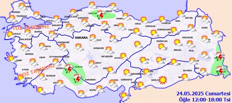 Meteoroloji Genel Müdürlüğü tarafından yapılan tahminlere göre; ülkemiz genelinin parçalı ve az bulutlu, öğle saatlerinden sonra Konya, Kastamonu ve Hakkari çevreleri ile Isparta’nın güney ve doğu, Karaman’ın batı ve Van’ın doğu ilçelerinin sağanak ve gök gürültülü sağanak yağışlı geçeceği tahmin ediliyor. Yurdun batı kesimlerinde toz taşınımı bekleniyor.