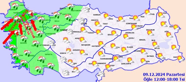 Meteoroloji Genel Müdürlüğü tarafından yapılan son tahminlere göre: Ülkemizin kuzey, iç ve batı kesimlerinin parçalı ve çok bulutlu, Marmara, Ege (Afyonkarahisar hariç), Batı Akdeniz, İç Anadolu’nun kuzeybatısı ile Batı Karadeniz’in(Sinop hariç)yağmur ve sağanak, Marmara ile Kıyı Ege’nin yer yer gök gürültülü sağanak yağışlı, diğer yerlerin az bulutlu ve açık geçeceği tahmin ediliyor. Yağışların; Marmara’nın batısı ile Ege kıyılarında kuvvetli (21-50 kg/m2), Balıkesir’in batı kıyıları ile Muğla çevrelerinde yer yer çok kuvvetli ve şiddetli (51-100 kg/m2) olması bekleniyor. Ülkemizin iç ve doğu kesimlerinde buzlanma ve don ile birlikte pus ve yer yer sis bekleniyor.