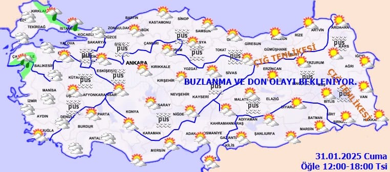 Meteoroloji Genel Müdürlüğü tarafından yapılan tahminlere göre: Ülkemizin batı kesimlerinin yer yer çok bulutlu, Çanakkale’nin doğu ilçeleri, Balıkesir’in batı kesimleri ile Kırklareli ve İstanbul’un kuzey kesimlerinin aralıklı sağanak yağışlı, diğer yerlerin parçalı ve az bulutlu geçeceği tahmin ediliyor. İç ve doğu kesimlerde buzlanma ve don ile birlikte Marmara ile iç ve doğu kesimlerde pus ve yer yer sis bekleniyor. Doğu Karadeniz’in iç kesimlerinin yüksekleri ile Doğu Anadolu’nun yüksek ve dik yamaçlarında çığ tehlikesi bulunmaktadır.