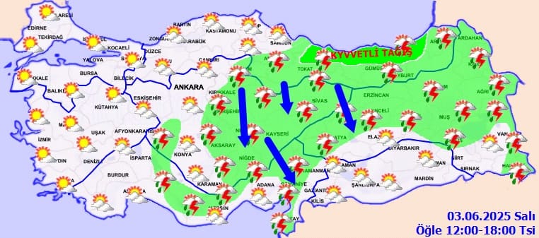 Meteoroloji’den yapılan son hava durumu tahminlerine göre; Akdeniz’in iç kesimleri, İç Anadolu’nun orta ve doğu kesimleri, Doğu Karadeniz ile Doğu Anadolu Bölgesi gök gürültülü sağanak yağmurlu olacak. Yağışların; Samsun, Ordu, Giresun, Trabzon ve Rize çevrelerinde kuvvetli olması bekleniyor. Hava sıcaklıklarının iç ve batı kesimlerde mevsim normallerinin 2 ila 4 derece üstünde seyretmesi bekleniyor.