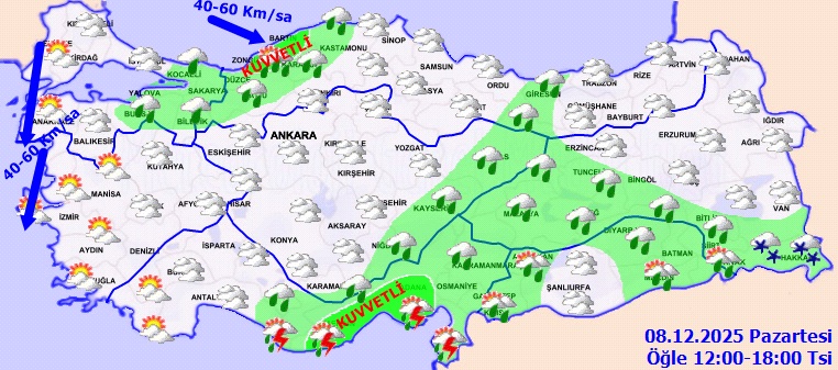 Meteoroloji Genel Müdürlüğü tarafından yapılan son tahminler, Türkiye genelinde parçalı ve çok bulutlu bir havanın etkili olacağını gösterirken, ülkenin batı ve doğu bölgelerinde kuvvetli yağış ve fırtına alarmı verildi. Marmara, İç Anadolu’nun doğusu, Akdeniz, Batı Karadeniz, Doğu ve Güneydoğu Anadolu’nun (bazı iller hariç) geniş kesimlerinde aralıklı yağış bekleniyor. Özellikle Batı Karadeniz kıyıları ile Mersin, Adana, Bingöl, Muş ve Hakkari çevrelerinde yağışların yer yer kuvvetli olması bekleniyor.