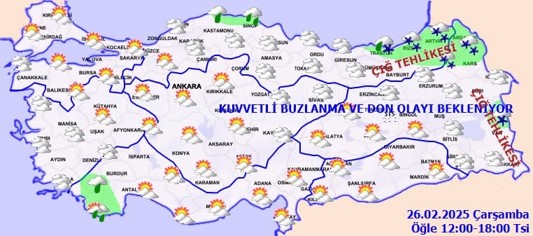 Doğu Karadeniz’in iç kesimlerinin yüksekleri ile Doğu Anadolu’nun doğusunun dik ve eğimli yamaçlarında çığ tehlikesi ile yurdun kuzey, iç ve doğu kesimlerinde yer yer kuvvetli olmak üzere buzlanma ve don olayı beklendiğinden meydana gelebilecek olumsuzluklara karşı dikkatli ve tedbirli olunması gerekmektedir.