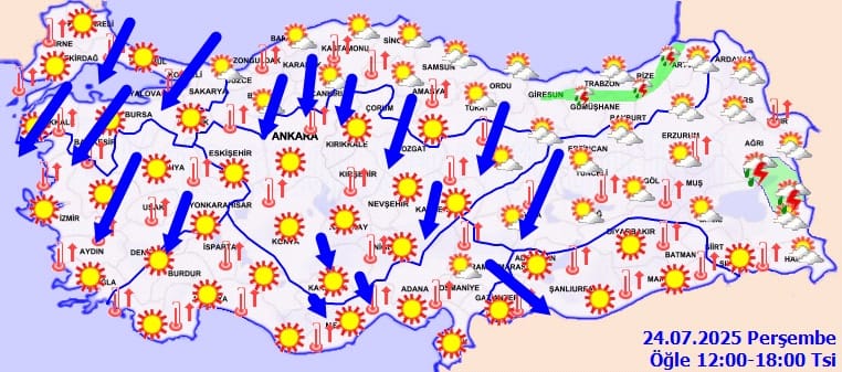 Meteoroloji’den yapılan son hava durumu tahminlerine göre; Türkiye yüksek sıcaklıklarla birlikte kuvvetli poyrazın etkisi altında. Doğu Karadeniz ve Van çevrelerinde yağmur geçişleri beklenirken, diğer bölgelerde hızı 50 km’yi bulan rüzgar etkili olacak.