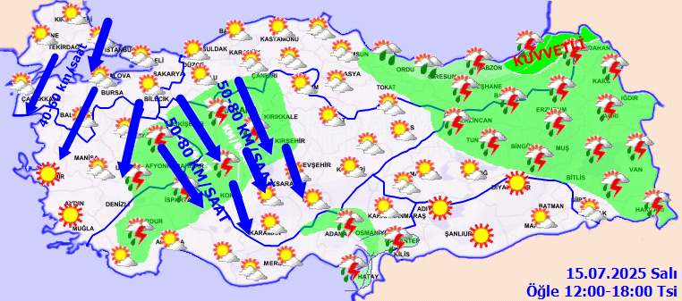 Meteoroloji’den yapılan son hava durumu tahminlerine göre; Marmara, Kuzey Ege, İç Anadolu’da kuvvetli poyraz etkili olurken, Ege’nin doğusu, Batı ve Doğu Akdeniz, İç Anadolu’nun batısı, Doğu Karadeniz ile Doğu Anadolu’nun büyük bölümü gök gürültülü sağanak yağmurlu olacak. Hava sıcaklıkları mevsim normali üzerinde seyretmeyi sürdürüyor.