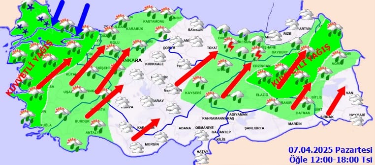 Meteoroloji’den yapılan son hava durumu tahminlerine göre; Türkiye soğuk ve yağışlı havanın etkisi altında. Marmara, Ege, Akdeniz’in batısı, Batı Karadeniz ile İç Anadolu’nun batısı, Doğu Karadeniz, Doğu Anadolu bölgeleri gök gürültülü sağanak yağmurlu olacak. Trakya’da ise kar yağışı bekleniyor. Yağışların; Yağışların, Marmara, Kıyı Ege ile Manisa, Ardahan, Kars, Erzurum, Tunceli, Muş ve Bingöl çevrelerinde kuvvetli olması bekleniyor.