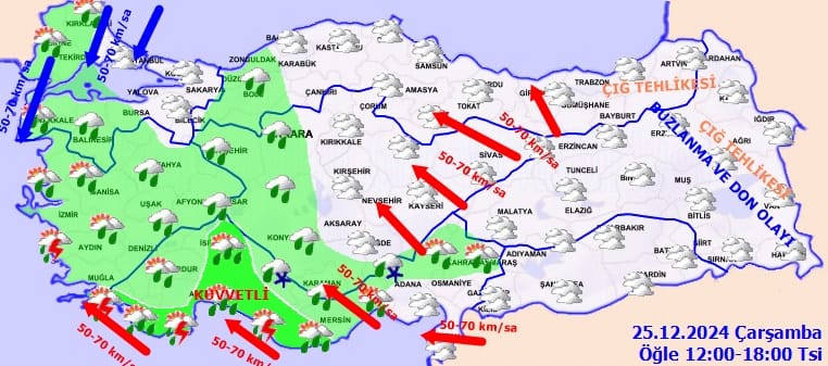 Meteoroloji Genel Müdürlüğü tarafından yapılan son tahminlere göre: Ülkemiz genelinin çok bulutlu, Marmara’nın güney ve batısı, Ege, (Hatay ve Osmaniye dışında) Akdeniz, İç Anadolu’nun güney ve batısı ile Batı Karadeniz ve Güneydoğu Anadolu’nun batısının yağışlı geçeceği tahmin ediliyor. Ege’nin güney kıyıları, Doğu Akdeniz’in batısı ve Batı Akdeniz’de kuvvetli olması beklenen yağışların, genellikle yağmur ve sağanak, Ege ve Akdeniz kıyılarında yer yer gök gürültülü sağanak, Batı Karadeniz’in yükseklerinde ve Akdeniz’in Toroslar kesiminde karla karışık yağmur ve yer yer kar şeklinde görüleceği tahmin ediliyor. Ülkemizin doğu kesimlerinde buzlanma ve don olayı bekleniyor. Doğu Karadeniz’in iç kesimlerinin yüksekleri ile Doğu Anadolu’nun doğusunun dik ve eğimli yamaçlarında çığ tehlikesi bulunmaktadır.