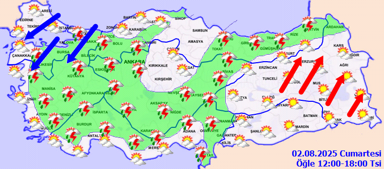 Meteoroloji’den yapılan son hava durumu tahminlerine göre; Marmara’nın güney ve doğusu, Ege ve Akdeniz’in iç kesimleri, İç Anadolu’nun batı, güney ve doğu kesimleri ile Doğu Karadeniz gök gürültülü sağanak yağmurlu olacak. Hava sıcaklıkları iç ve doğu kesimlerde birkaç derece düşecek. Marmara’da poyraz etkili olurken, Doğu Anadolu’da lodos bekleniyor.