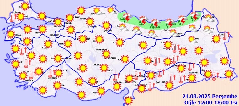 Meteoroloji’den yapılan son hava durumu tahminlerine göre; Türkiye genelinde sıcak hava etkili olacak. Doğu Karadeniz’in kıyı kesimlerinde yağmur beklenirken diğer bölgeler az bulutlu ve açık geçecek.