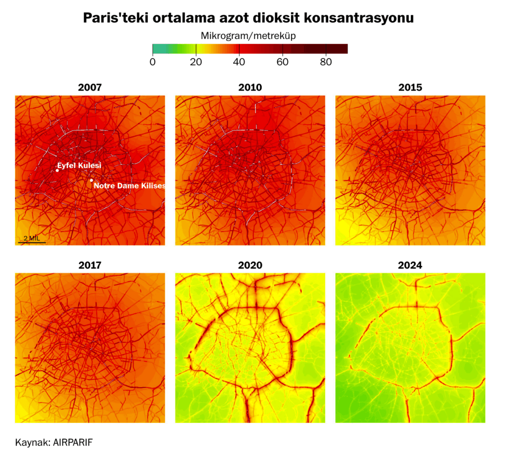 Airparif tarafından yayınlanan hava kalitesi ısı haritaları, Paris’in dönüşümünü gözler önüne seriyor. 2005’te şehrin büyük bölümü nitrojen dioksit sınırlarını aşarken, 2023’te yalnızca birkaç ana yol bu eşiği geçiyor. Yoğun kırmızı bölgeler, artık sadece ince yollar şeklinde haritada yer alıyor.