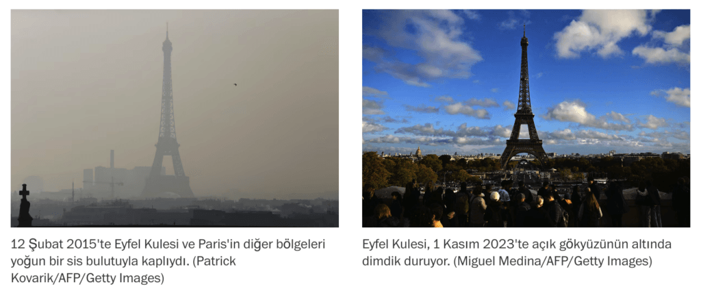Airparif adlı bağımsız çevre izleme kuruluşunun verilerine göre; PM 2.5 (ince partikül madde) seviyeleri %55 azaldı, nitrojen dioksit (NO₂) seviyeleri %50 düştü. Bu iyileşme, fosil yakıt kullanımını sınırlayan ve motorlu taşıtları şehir merkezinden uzaklaştıran politikalar sayesinde gerçekleşti.