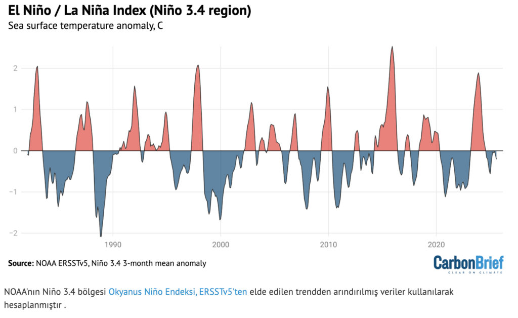 - Tahmini Katkı: Carbon Brief’in analizine göre El Niño, 2023 sıcaklıklarına mütevazı bir 0,013°C, 2024 sıcaklıklarına ise daha önemli bir 0,128°C katkıda bulundu.