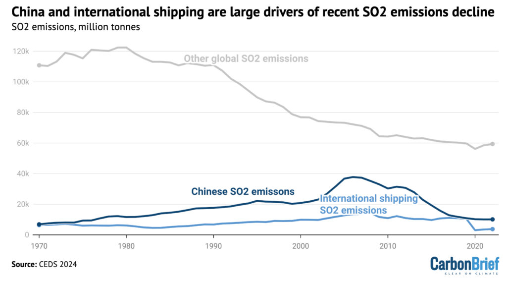 Kükürt dioksit (SO2), kömür ve petrol yakılmasıyla atmosfere salınan ve güçlü bir soğutma etkisi yaratan bir aerosoldür. Küresel SO2 emisyonları son 18 yılda yaklaşık %40 azaldı; bunun en büyük nedenleri Çin’deki emisyonlardaki %70’lik azalma ve Uluslararası Denizcilik Örgütü’nün (IMO) 2020 kuralı ile gemi yakıtının kükürt içeriğinde %80’lik bir düşüşe yol açılmasıydı.
