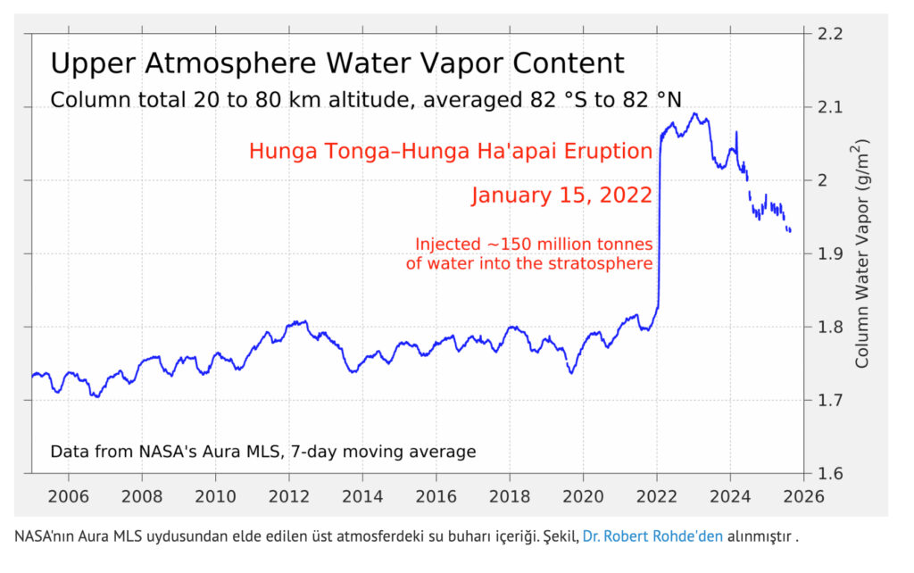 - Su Buharı Etkisi: Bu patlama, atmosfere muazzam miktarda deniz suyunu buharlaştırarak yaklaşık 146 milyon metrik ton su buharını stratosfere taşıdı. Su buharı, güçlü bir sera gazı olup, stratosferde yıllarca kalarak iklim üzerinde ısınma etkisi yaratabilir.