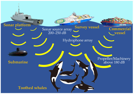 Petrol sızıntıları ve mühimmatın yanı sıra, askeri sonar sistemlerinden kaynaklanan akustik bozulmanın da yunuslar için kritik bir tehdit oluşturduğu ve yunusların karaya vurmasına ve ölmesine yol açtığı düşünülüyor. Gemiler ve denizaltılar tarafından sonar kullanımının, özellikle Kerç Köprüsü ve Rus kontrolündeki bölgelerde yoğun olması muhtemel.
