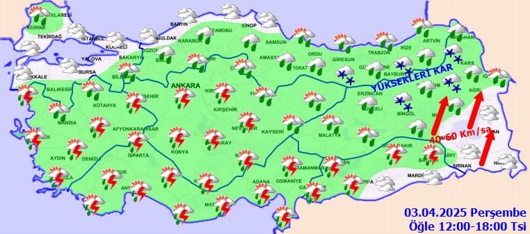 Meteoroloji Genel Müdürlüğü, ülke genelinde parçalı ve çok bulutlu bir havanın hâkim olacağını ve birçok bölgede sağanak yağış beklendiğini duyurdu. Özellikle Marmara, Ege, Akdeniz, İç Anadolu, Karadeniz ve Doğu ile Güneydoğu Anadolu’nun kuzey ve batısında yer yer gök gürültülü sağanak yağış görülebilir. Doğu Karadeniz’in yüksek kesimleri ile Doğu Anadolu’nun kuzeydoğusunda ise karla karışık yağmur ve kar yağışı bekleniyor. Ayrıca, Doğu Anadolu’nun güneydoğusunda kuvvetli rüzgâr etkili olacak.