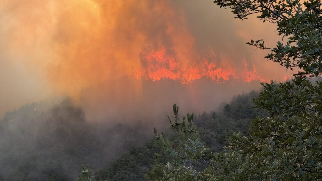 Yangının köy yakınlarına ulaşması sırasında, alevlerden kaçan bir tilki de görüntülere yansıdı. Ormanlık alandan çıkan tilki, koşarak alevlerin olmadığı güvenli bir bölgeye doğru ilerledi.