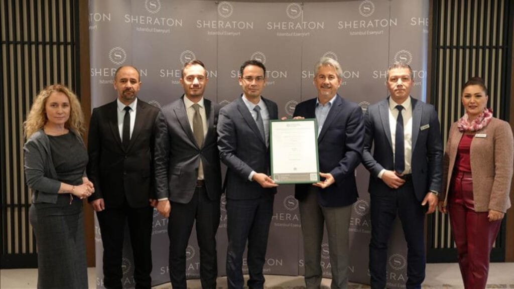 Sheraton İstanbul Esenyurt’un I-REC sertifikası, CK Enerji Boğaziçi Elektrik Genel Müdürü Ali Erman Aytac tarafından Güray Gayrimenkul Geliştirme İnşaat AŞ Yönetim Kurulu Başkanı Gürel Aydın’a takdim edildi.