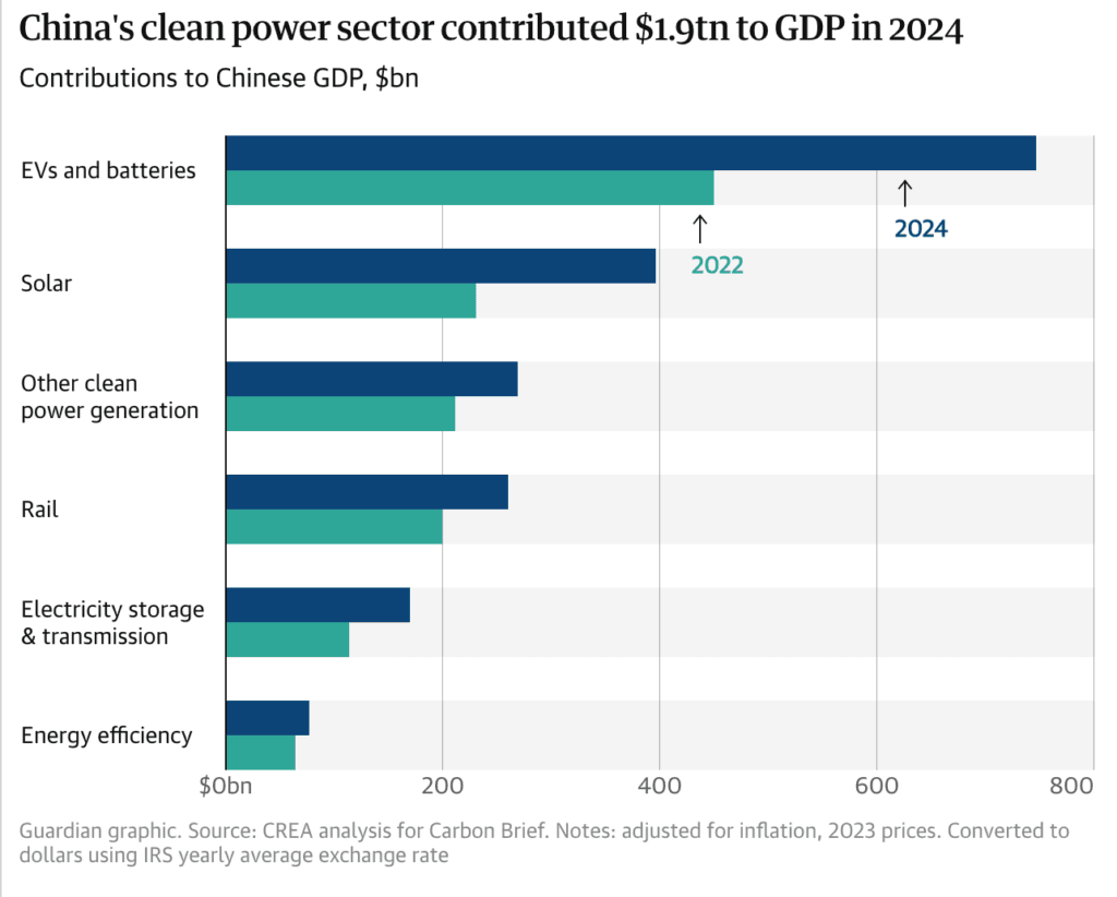 Carbon Brief tarafından yapılan analiz, geçtiğimiz yıl Çin’in temiz enerji ekonomisine en büyük katkıyı elektrikli araçlar ve bataryaların sağladığını ortaya koydu. Bu iki sektör, toplam temiz enerji ekonomisinin yaklaşık %39’unu oluşturdu.